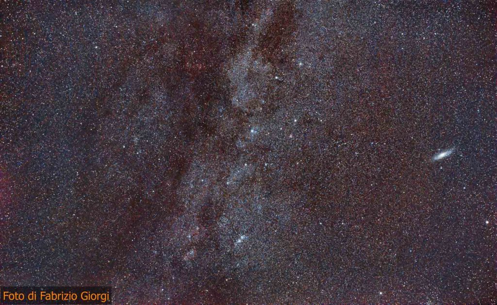 In questa foto, Cassiopea è elegante e riconoscibile, con la sua forma che assomiglia a una “M” distesa tra le montagne. È attraversata dalla Via Lattea e accanto a sé custodisce un’altra meraviglia: un accenno della Galassia di Andromeda, un viaggio lontanissimo che inizia proprio sopra la nostra testa.